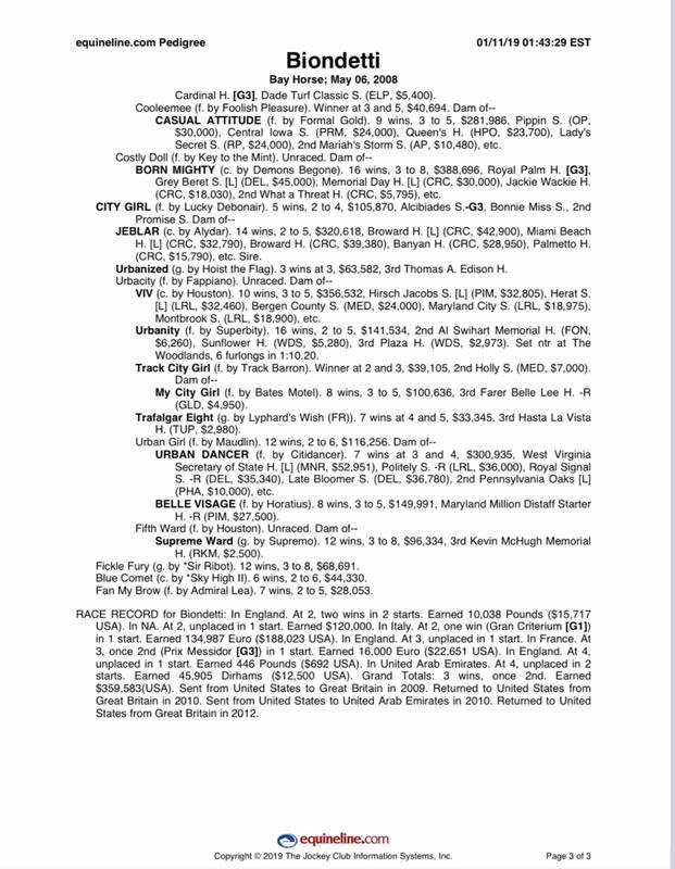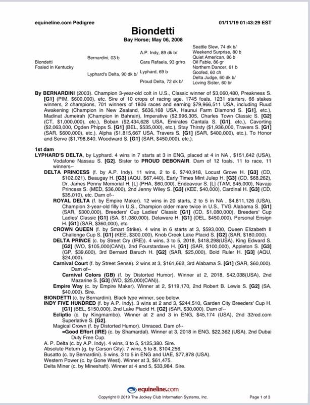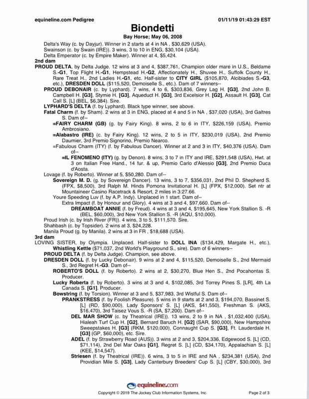 BIONDETTI was undefeated in his first three starts at 2 including the Gran Criterium G1, at a mile and finished on the board in the Grey Goose Breeders Cup Juvenile G1 at Churchill Downs.